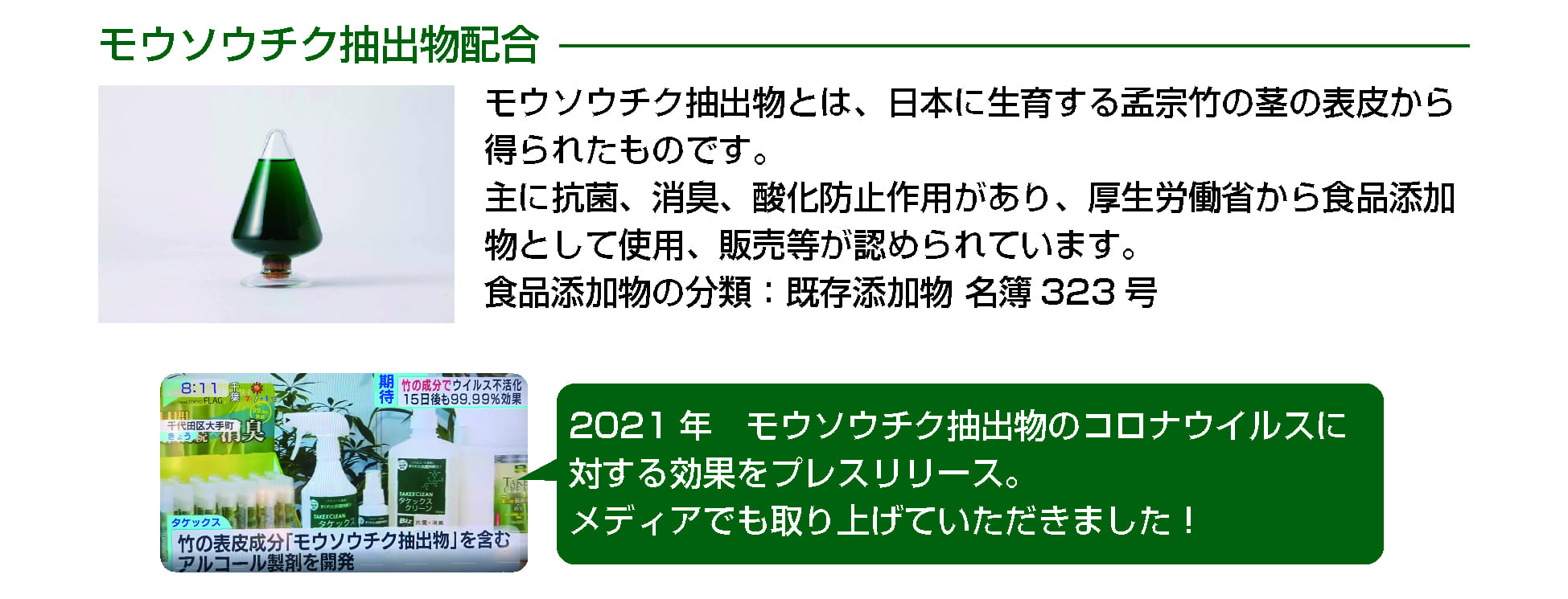 竹と高濃度アルコールの力でウイルス雑菌強力除去。