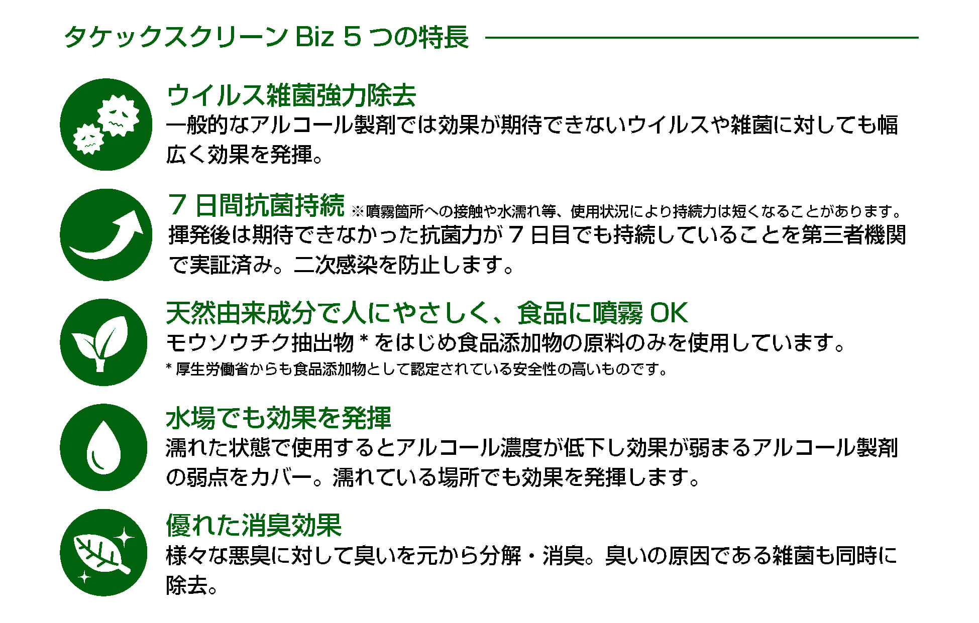 ウイルス・雑菌等に幅広い効果を発揮する『タケックスクリーンBiz』です。