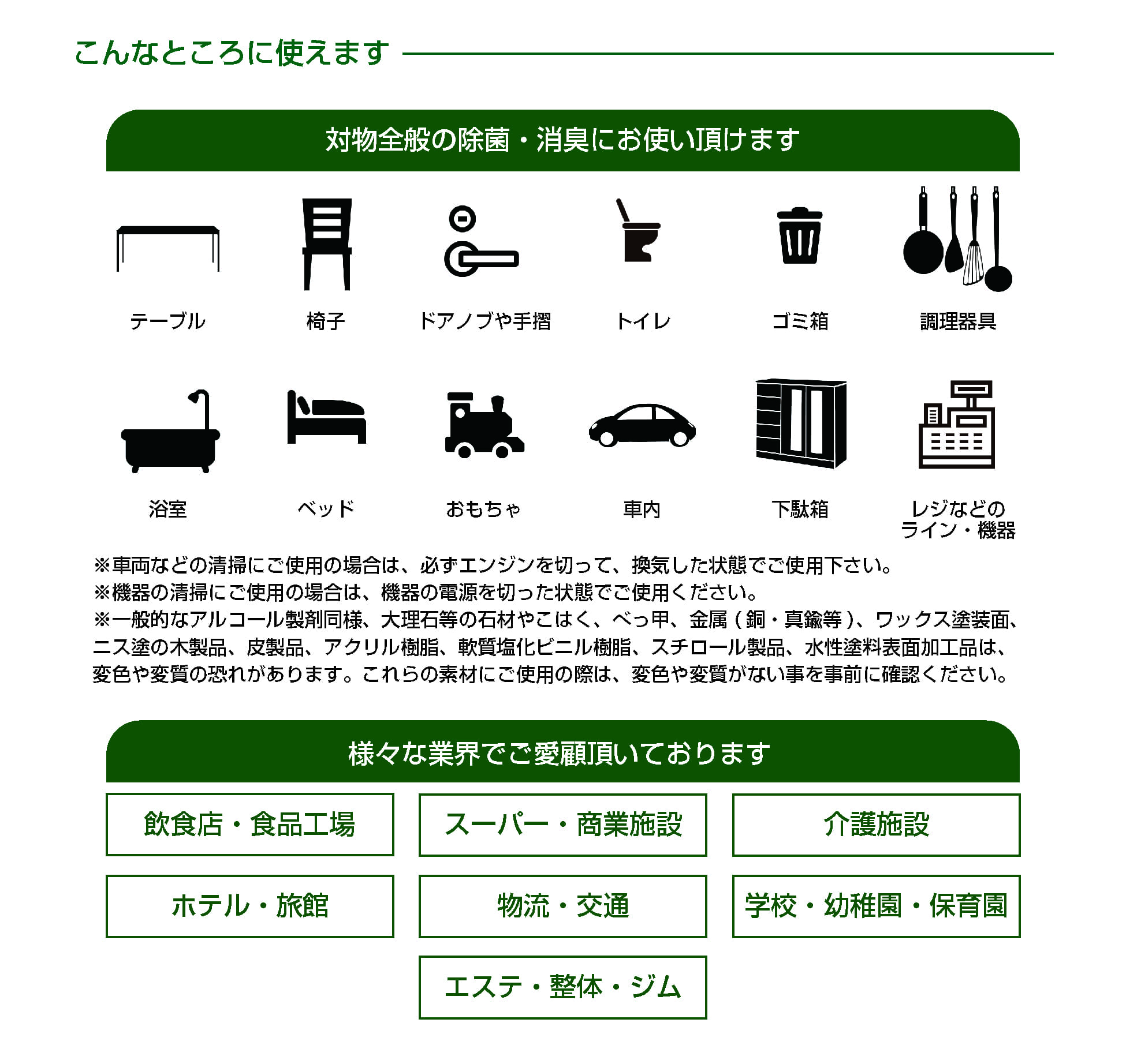 厨房などの飲食業等の現場だけでなく、手洗い場やトイレ、テーブルなど対物全般にお使いいただけます。